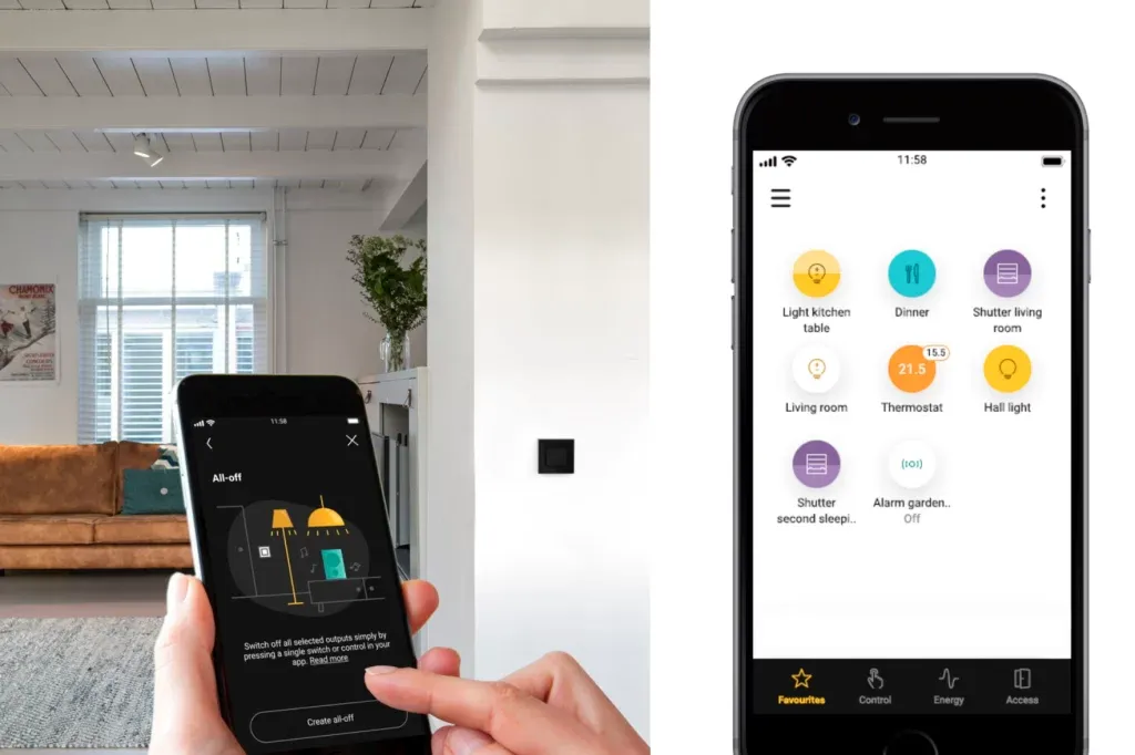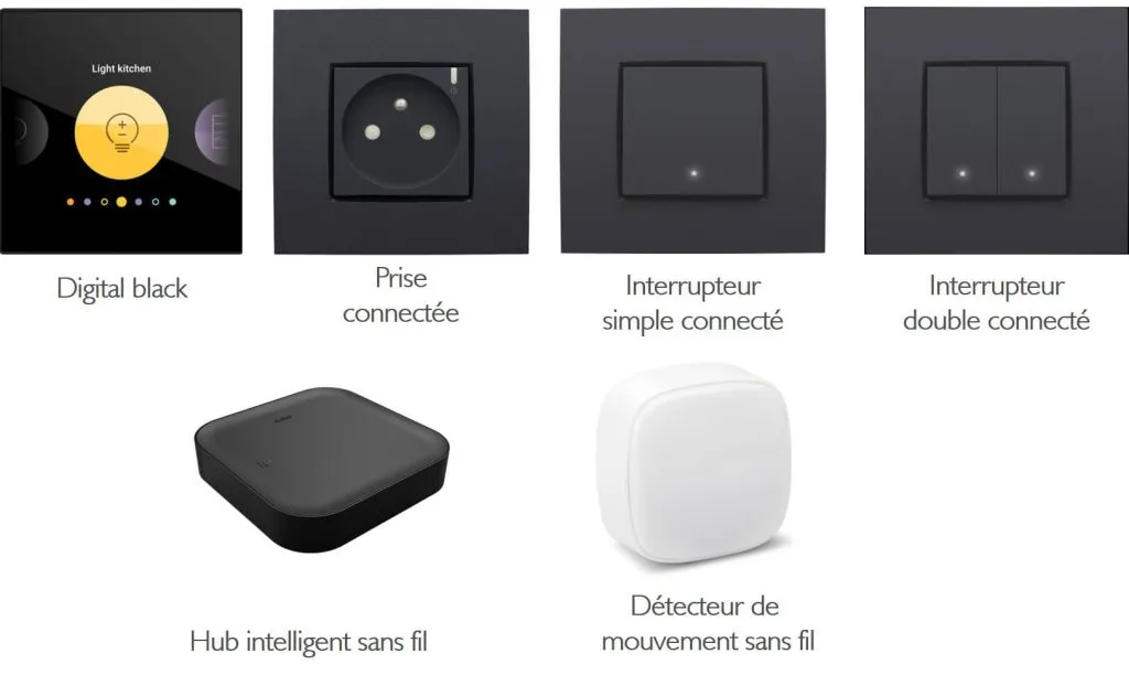 Le dispositif comprend un hub intelligent sans fil ainsi que des prises, des interrupteurs, des commandes et des détecteurs sans fil connectés. Vous pouvez ajouter d’autres commandes quand vous le désirez afin d’optimiser la gestion de votre installation. Vous pouvez programmer des scénarios et réguler toute l’installation via une application intuitive.